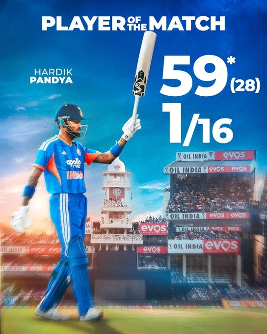 ଟିମ୍ ଇଣ୍ଡିଆର ଇନିଂସ୍କ କୁ ହାର୍ଦ୍ଦିକ ପାଣ୍ଡ୍ୟା ଚମତ୍କାରୀ ବ୍ୟାଟିଂ ବଳରେ ପୂରା ବଦଳାଇ ଦେଇଥିଲେ। ହାର୍ଦ୍ଦିକପାଣ୍ଡ୍ୟା ବିସ୍ଫୋରକ ଅର୍ଦ୍ଧଶତକ ହାସଲ କରିଥିଲେ। ହାର୍ଦ୍ଦିକ ଅପରାଜିତ ୫୯ ରନ୍ ସଂଗ୍ରହ କରିଥିଲେ। ସେ ୨୮ଟି ବଲ୍ ଖେଳି ୬ଟି ଚୌକା ଓ ୪ଟି ଛକା ମାରିଥିଲେ।