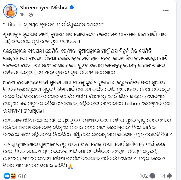 ଶ୍ରୀମୟୀ ମିଶ୍ର ନାଁ ନନେଇ ପୂର୍ବତନ ଆଇଏଏସ୍ ଅଧିକାରୀ ସୁଜାତା ପାଣ୍ଡିଆନ ଙ୍କୁ ‘ଶକ୍ତି ନାନୀ’ କହି ଟାର୍ଗେଟ କରିଛନ୍ତି। ସେ କହିଛନ୍ତି ଯେ ‘ଶକ୍ତି ନାନୀ’ କୁଆଡ଼େ ରାଜ୍ୟସଭା ଯିବାକୁ ଶକ୍ତି ଗୋଟାଉଛନ୍ତି ଏବଂ ତାଙ୍କର ରାଜନୀତିରେ ଏଣ୍ଟ୍ରି ହେଲେ ପୁଣି ଏକ ନୂଆ ସମୀକରଣ ସୃଷ୍ଟି ହେବ।