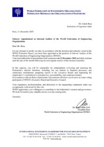 ନିଯୁକ୍ତି ସଂପର୍କିତ ଯୋଗାଯୋଗରେ ଡବ୍ଲ୍ୟୁ.ଏଫ.ଇ.ଓ. ର କାର୍ଯ୍ୟକାରି ବୋର୍ଡ ମତ ପ୍ରକାଶ କରିଛି ଯେ, ଇଞ୍ଜିନିୟର ଅଶୋକ ବସାଙ୍କର ଦୀର୍ଘ ବର୍ଷର ଅନୁଭବ, ପେଶାଦାରିତା ଏବଂ ଇଞ୍ଜିନିୟରିଂ ସମୁଦାୟ ପ୍ରତି ତାଙ୍କର ନିଷ୍ଠା ଯୋଗୁଁ ସେ ଏହି ଦାୟିତ୍ୱ ନେବା ଅତ୍ୟନ୍ତ ଉପଯୁକ୍ତ । ଏହି ନିଯୁକ୍ତିର କାର୍ଯ୍ୟକାଳ ୧୨ ଡିସେମ୍ବର ୨୦୨୫ ଠାରୁ କାର୍ଯ୍ୟକାରୀ ହୋଇଛି ଏବଂ ଡବ୍ଲ୍ୟୁ.ଏଫ.ଇ.ଓ. ର ସଂବିଧାନ ଅନୁଯାୟୀ ପୁନଃନବୀକରଣ ଯୋଗ୍ୟ ରହିବ।