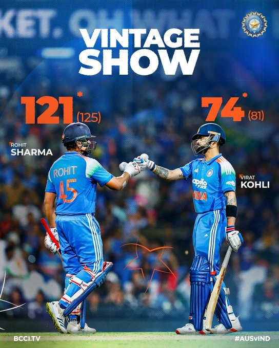 ୨୩୭ ରନ୍ର ବିଜୟ ଲକ୍ଷ୍ୟକୁ ଟିମ୍ ଇଣ୍ଡିଆ ୧୧.୩ ଓଭର ପୂର୍ବରୁ ମାତ୍ର ଗୋଟିଏ ୱିକେଟ୍ ବିନିମୟରେ ହାସଲ କରି ନେଇଛି। ୦-୨ରେ ପଛୁଆ ରହିବା ପରେ ମୂଳପୋଛ ପରାଜୟର ଲଜ୍ଜାକୁ ଏଡ଼ାଇଛି। ଏକମାତ୍ର ବ୍ୟାଟର୍ ଭାବେ ଅଧିନାୟକ ଶୁବମନ୍ ଗିଲ୍ ୨୪ ରନ୍ କରି ଆଉଟ୍ ହୋଇଥିଲେ। ଗିଲ୍-ରୋହିତ ପ୍ରଥମ ୱିକେଟ୍ରେ ୬୯ ରନ୍ ଯୋଡ଼ିଥିଲେ। ଏହା ପରେ ରୋହିତ-କୋହଲି ନିଜ ପୁରୁଣା ଯାଦୁ ଦେଖାଇ ଶତକୀୟ ଭାଗୀଦାର ସହ ବିଜୟ ମୁଣ୍ଡି ମାରିଥିଲେ। ଅଷ୍ଟ୍ରେଲିଆ ବିପକ୍ଷରେ ନବମ ଶତକ ଅର୍ଜନ ସହ ମୋଟ ଉପରେ ୨୨୪ ରନ୍ କରିଥିବା ରୋହିତ ମ୍ୟାଚ୍ ସହ ଶୃଙ୍ଖଳାର ଶ୍ରେଷ୍ଠ ଖେଳାଳି ମଧ୍ୟ ବିବେଚିତ ହୋଇଥିଲେ।