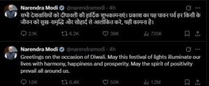 ଆଜି ଦୀପାବଳି । ଏହି ଅବସରରେ ରାଷ୍ଟ୍ରପତି ଦ୍ରୈାପଦୀ ମୁର୍ମୁ, ପ୍ରଧାନମନ୍ତ୍ରୀ ନରେନ୍ଦ୍ର ମୋଦୀ, ଦେଶବାସୀଙ୍କୁ ଆଲୋକର ପର୍ବ ଦୀପାବଳି ଅବସରରେ ଶୁଭେଚ୍ଛା ଜଣାଇଛନ୍ତି। ପ୍ରଧାନମନ୍ତ୍ରୀ ମୋଦି ନିଜର ବାର୍ତ୍ତାରେ ଏକ୍ସରେ ପୋଷ୍ଟ କରି ଲେଖିଛନ୍ତି, ମୋର ସମସ୍ତ ଦେଶବାସୀଙ୍କୁ ଦୀପାବଳିର ହାର୍ଦ୍ଦିକ ଶୁଭେଚ୍ଛା।
