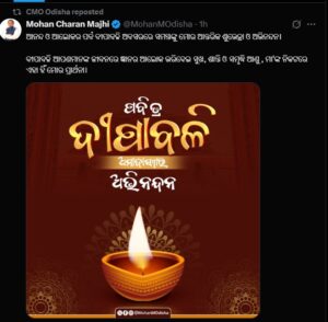 ମୁଖ୍ୟମନ୍ତ୍ରୀ ମୋହନ ମାଝୀ ମଧ୍ୟ ଦୀପାବଳି ଅବସରରେ ଶୁଭେଚ୍ଛା ଜଣାଇଛନ୍ତି । ଏକ୍ସରେ ମୁଖ୍ୟମନ୍ତ୍ରୀ ପୋଷ୍ଟ କରିଛନ୍ତି ‘’ଆନନ୍ଦ ଓ ଆଲୋକର ପର୍ବ ଦୀପାବଳି ଅବସରରେ ସମସ୍ତଙ୍କୁ ମୋର ଆନ୍ତରିକ ଶୁଭେଚ୍ଛା ଓ ଅଭିନନ୍ଦନ। ଦୀପାବଳି ଆପଣମାନଙ୍କ ଜୀବନରେ ଜ୍ଞାନର ଆଲୋକ ଭରିଦେଇ ସୁଖ, ଶାନ୍ତି ଓ ସମୃଦ୍ଧି ଆଣୁ , ମା’ଙ୍କ ନିକଟରେ ଏହା ହିଁ ମୋର ପ୍ରାର୍ଥନା’’ । ଆଲୋକର ଏହି ପବିତ୍ର ପର୍ବ ସମସ୍ତଙ୍କ ଜୀବନକୁ ସୁଖ, ସମୃଦ୍ଧି ଏବଂ ସଦ୍ଭାବରେ ଆଲୋକିତ କରୁ ବୋଲି ଲେଖିଛନ୍ତି ମୁଖ୍ୟମନ୍ତ୍ରୀ ।