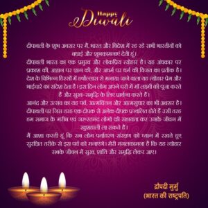 ସେହିପରି ରାଷ୍ଟ୍ରପତି ଦ୍ରୌପଦୀ ମୁର୍ମୁ ପବିତ୍ର ଦୀପାବଳିର ଅବସରରେ ଦେଶବାସୀଙ୍କୁ ଶୁଭେଚ୍ଛା ଏବଂ ଶୁଭକାମନା ଜଣାଇଛନ୍ତି। ସେ କହିଛନ୍ତି , ପବିତ୍ର ଦୀପାବଳିର ଅବସରରେ ମୁଁ ଭାରତ ଏବଂ ବିଶ୍ୱର ସମସ୍ତ ଭାରତୀୟଙ୍କୁ ମୋର ହାର୍ଦ୍ଦିକ ଶୁଭେଚ୍ଛା ଏବଂ ଶୁଭକାମନା ଜଣାଉଛି। ରାଷ୍ଟ୍ରପତି କହିଛନ୍ତି ଯେ ଆନନ୍ଦର ଏହି ପର୍ବ ଆତ୍ମବିଶ୍ବାସର ଏକ ଅବସର। “ମୁଁ ସମସ୍ତଙ୍କୁ ନିରାପଦ, ଦାୟିତ୍ୱପୂର୍ଣ୍ଣ ଏବଂ ପରିବେଶ ଅନୁକୂଳ ଭାବରେ ଦୀପାବଳି ପାଳନ କରିବାକୁ ଅନୁରୋଧ କରୁଛି। ଏହି ଦୀପାବଳି ସମସ୍ତଙ୍କ ପାଇଁ ସୁଖ, ଶାନ୍ତି ଏବଂ ସମୃଦ୍ଧି ଆଣିଦେଉ,” ଏବଂ ଭାରତ ଏବଂ ବିଶ୍ୱର ସମସ୍ତ ଭାରତୀୟଙ୍କୁ ହାର୍ଦ୍ଦିକ ଶୁଭେଚ୍ଛା ଏବଂ ଶୁଭକାମନା ଜଣାଇଛନ୍ତି।