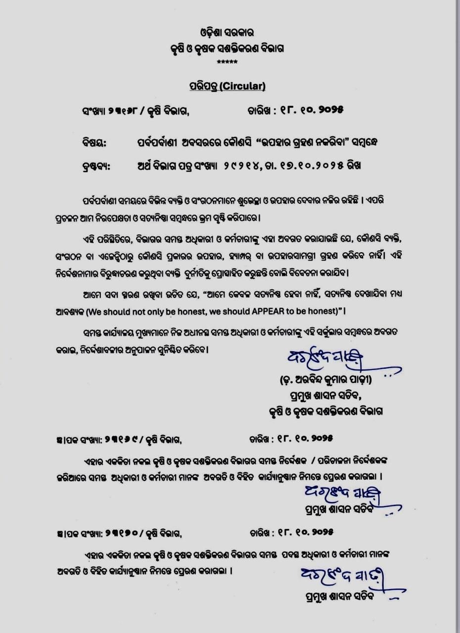 କେନ୍ଦ୍ର ସରକାରଙ୍କ ଭଳି ରାଜ୍ୟ ସରକାର ମଧ୍ୟ ‘ନୋ ଗିଫ୍ଟ ପଲିସି’ ଲାଗୁ କରିଛନ୍ତି । ଏନେଇ ଅର୍ଥ ବିଭାଗ ପକ୍ଷରୁ ସମସ୍ତ ବିଭାଗକୁ ପତ୍ର ଲେଖାଯାଇଛି । ପତ୍ରରେ ଉଲ୍ଳେଖ କରାଯାଇଛିଯେ, ଗତ ସେପ୍ଟେମ୍ବର ୧୯ରେ କେନ୍ଦ୍ର ସରକାର ପାର୍ବଣ ଋତୁ ପାଇଁ ନୋ ଗିଫ୍ଟ ପଲିସି ଆପଣାଇଥିଲେ । ଦୀପାବଳି କିମ୍ବା ଅନ୍ୟ କୌଣସି ଉତ୍ସବରେ ଉପହାର ପାଇଁ ସରକାରୀ ଖର୍ଚ୍ଚ ଉପରେ ପ୍ରତିବନ୍ଧକ ଲଗାଯାଇଛି । ରାଜ୍ୟ ସରକାର ମଧ୍ୟ ଏଭଳି ପଦକ୍ଷେପ ଗ୍ରହଣ କରିଛନ୍ତି । ଦୀପାବଳି ବା ଅନ୍ୟ କୌଣସି ଉତ୍ସବ ପାଇଁ କୌଣସି ସରକାରୀ ଅଫିସ୍ ବା ପିଏସୟୁ ଉପହାର ପାଇଁ ଅର୍ଥ ଖର୍ଚ୍ଚ କରିପାରିବେ ନାହିଁ । ଏହାକୁ କଡ଼ାକଡ଼ି ପାଳନ ପାଇଁ ଅର୍ଥ ବିଭାଗ ପକ୍ଷରୁ କୁହାଯାଇଛି । ବିତ୍ତୀୟ ଶୃଙ୍ଖଳା ଓ ଅନାବଶ୍ୟକ ଖର୍ଚ୍ଚ ହ୍ରାସ ନିମନ୍ତେ କେନ୍ଦ୍ର ସରକାର ଏଭଳି ପଦକ୍ଷେପ ଗ୍ରହଣ କରିଥିଲେ ।