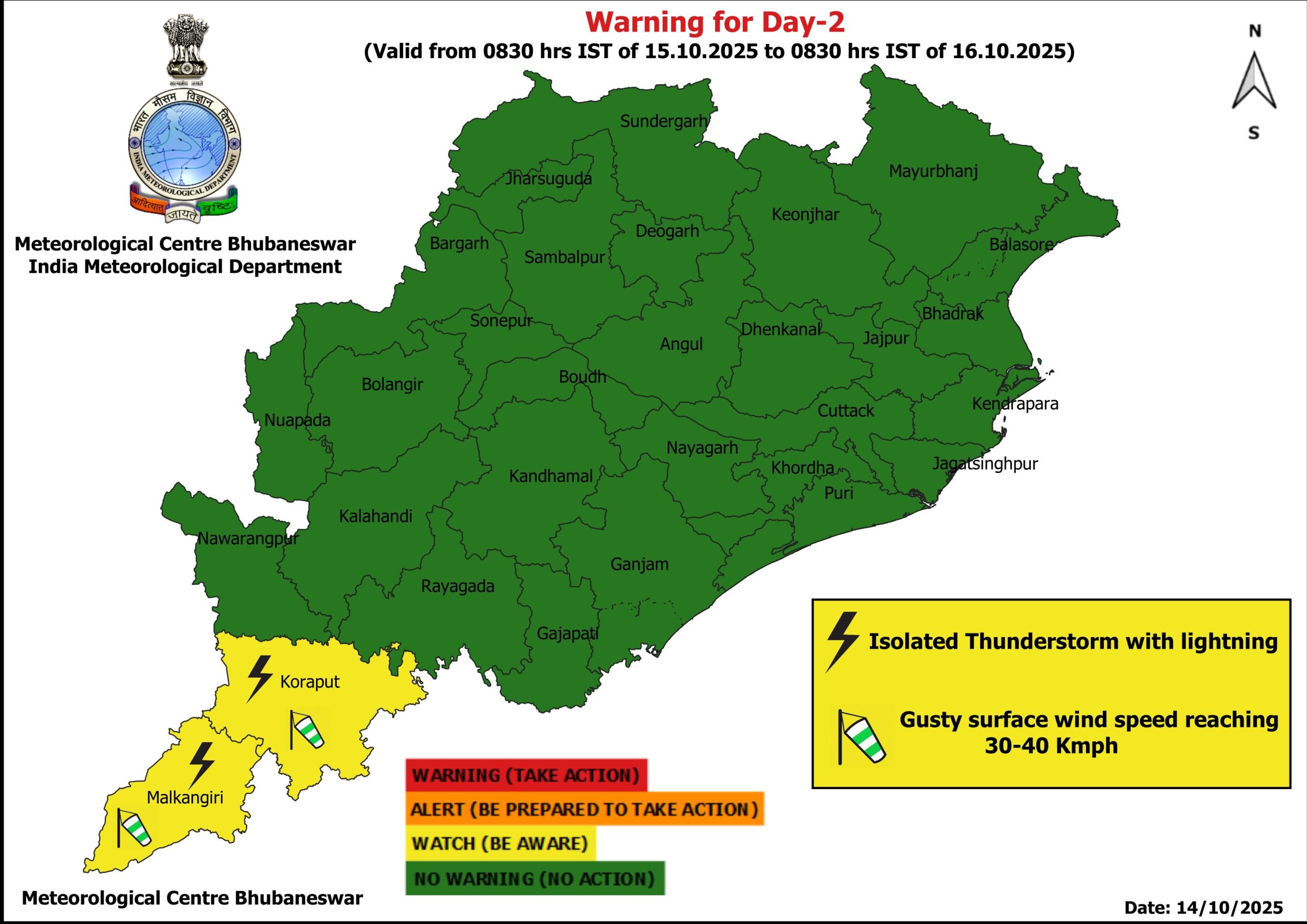 ଆଜି  ରାଜ୍ୟର ଅଧିକାଂଶ ଜିଲ୍ଲାରେ ପାଗ ଶୁଖିଲା ରହିବ । କିଛି ସ୍ଥାନରେ ବର୍ଷା ସାମାନ୍ୟ ହୋଇପାରେ । ମାଲକାନଗିରି, କୋରାପୁଟରେ ବର୍ଷା ସହ ଘଡ଼ଘଡ଼ି ହେବାର ସମ୍ଭାବନା ବେଶୀ ରହିଛି । କଟକ, ପୁରୀ, ଗଂଜାମ, ଖୋର୍ଧା ଜିଲ୍ଲାର କିଛି ସ୍ଥାନରେ ସଂଧ୍ୟାରେ ବର୍ଷା ହୋଇପାରେ ।  ପାଣିପାଗ ସ୍ଥିତି ଅନୁସାରେ ଦିନର ତାପମାତ୍ରା ବୃଦ୍ଧି ରହିବ । କିଛି ସ୍ଥାନରେ  ଆକାଶ ଆଶିଂକ ମେଘାଚ୍ଛନ ରହିବ । ଅଧିକ ବର୍ଷା ହେବାର ସମ୍ଭାବନା ନାହିଁ। ଦିନର ତାପମାନ 31 ରୁ 33 ଡିଗ୍ରି ସେଲସିଅସ ମଧ୍ୟରେ ରହିପାରେ । ସନ୍ଧ୍ୟାବେଳେ ହାଲକା ପବନ ବହିବ ଓ ଆକାଶ ସ୍ପଷ୍ଟ ରହିବ ।