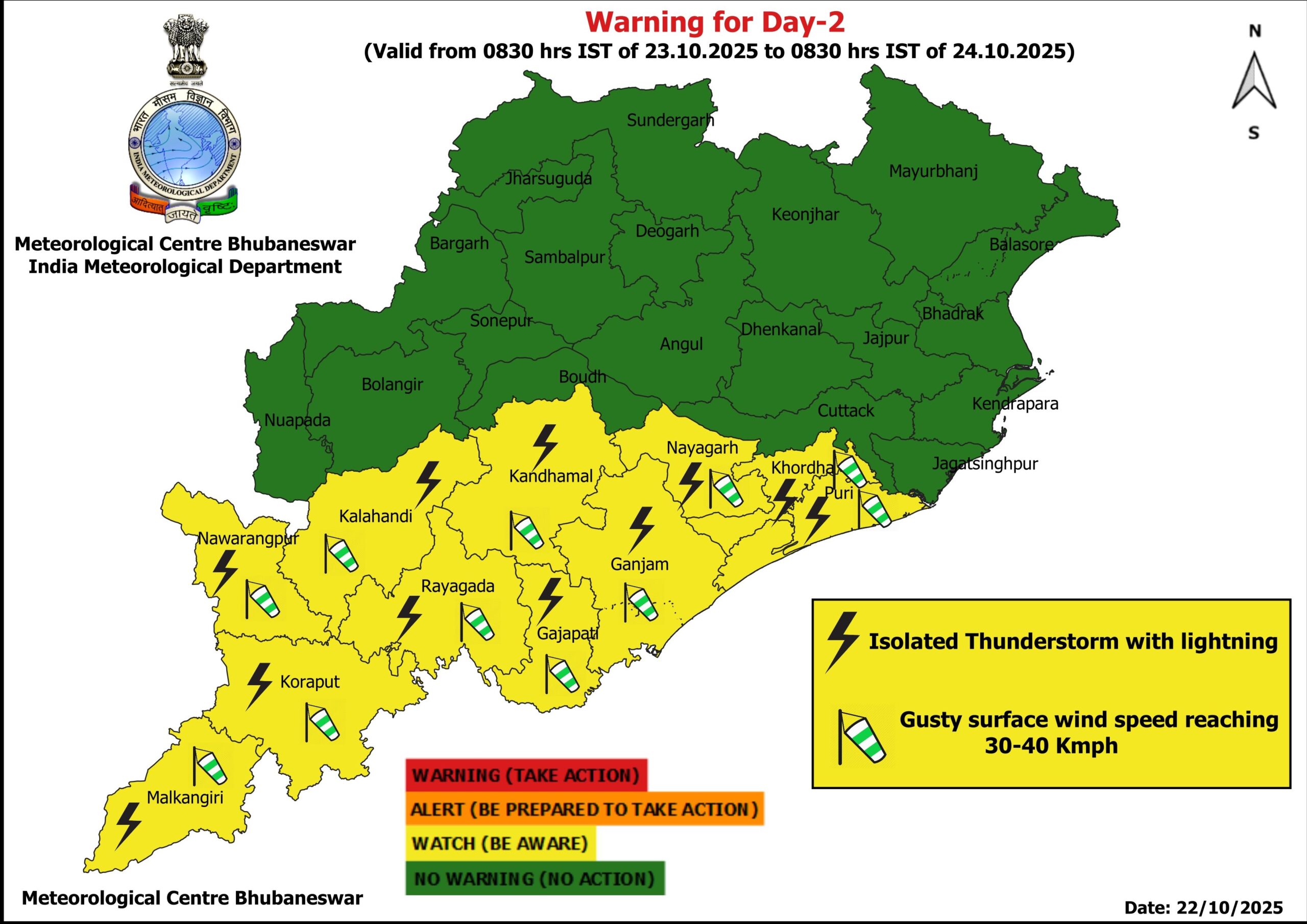 ବଙ୍ଗୋପସାଗରରେ ସୃଷ୍ଟ ଲଘୁଚାପ ପ୍ରଭାବରେ ଓଡ଼ିଶାର ବିଭିନ୍ନ ଅଞ୍ଚଳରେ ଆଜି ମଧ୍ୟ ବର୍ଷା ଜାରି ରହିବାର ସମ୍ଭାବନା ରହିଛି। ଭାରତୀୟ ପାଣିପାଗ ବିଭାଗ (IMD) ଅନୁଯାୟୀ, ପୁରୀ, ଖୋର୍ଦ୍ଧା, କଟକ, ଜଗତସିଂହପୁର ଓ କେନ୍ଦ୍ରାପଡ଼ା ଜିଲ୍ଲାଗୁଡ଼ିକରେ ମଧ୍ୟମ ଧରଣର ବର୍ଷା ହେବାର ସମ୍ଭାବନା ରହିଛି। କିଛି ସ୍ଥାନରେ ଘଣ୍ଟାପ୍ରତି ୩୦-୪୦ କିମି ବେଗରେ ପବନ ବହିବ ବୋଲି ସତର୍କ କରାଯାଇଛି। ରାଜଧାନୀ ଭୁବନେଶ୍ୱରରେ ସକାଳୁ ଆକାଶ ସଫା ରହିଛି ଏବଂ ପରେ ମେଘୁଆ ରହିବ । ବର୍ଷା ହେବାର ଆଶଙ୍କା ରହିଛି। ତାପମାତ୍ରା ୨୩°ସେ ରୁ ୩୦° ମଧ୍ୟରେ ରହିବ। ପୁରୀରେ ସମୁଦ୍ରକୁ ନ ଯିବାକୁ ପରାମର୍ଶ ଦିଆଯାଇଛି।